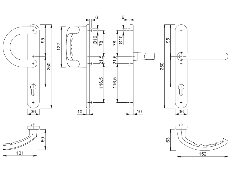 Dverová sada madlo-kľučka Hoppe Luxembourg na úzkom štítku je vyrobená z hliníka. Vnútorná strana je upevnená neviditeľne skrutkami M6, vonkajšia strana neviditeľne so spojovacími prvkami, dotiahnutá skrutkami M6. Sada je určená pre vchodové dvere s otvorom na cylindrickú vložku. Vzdialenosť medzi osou kľučky/gule a osou vložky je 92 mm. Kľučka je montovaná tak, že je otočná a má mechanizmus vratnej pružiny. Je prispôsobená pre hranol 8 mm a má stabilizačné čapy. Šírka štítku je 36 mm.